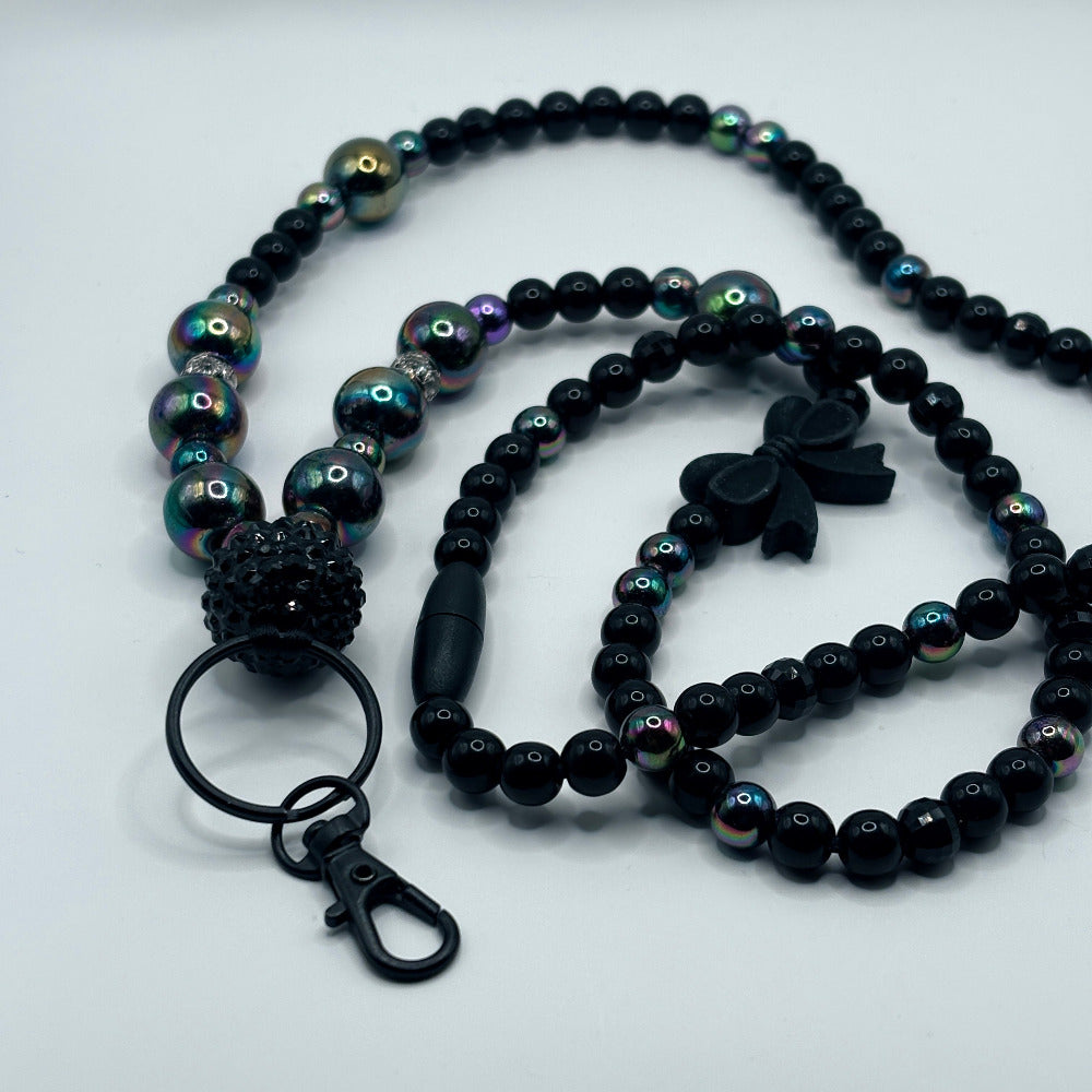 Punottu akryylihelmistä, turvalukko muovia, avainrengas metallia.