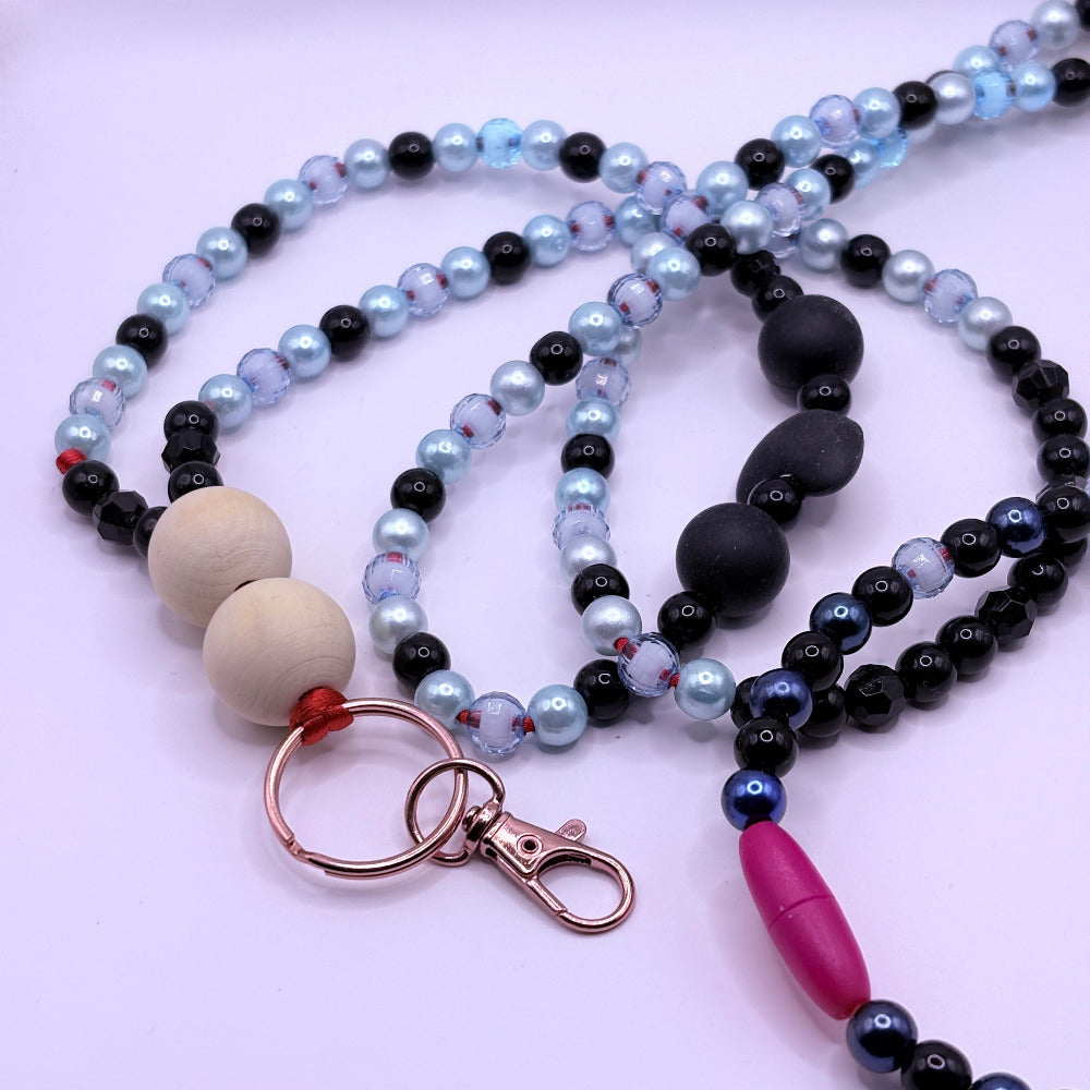 Punottu akryylihelmistä, turvalukko muovia, avainrengas metallia.