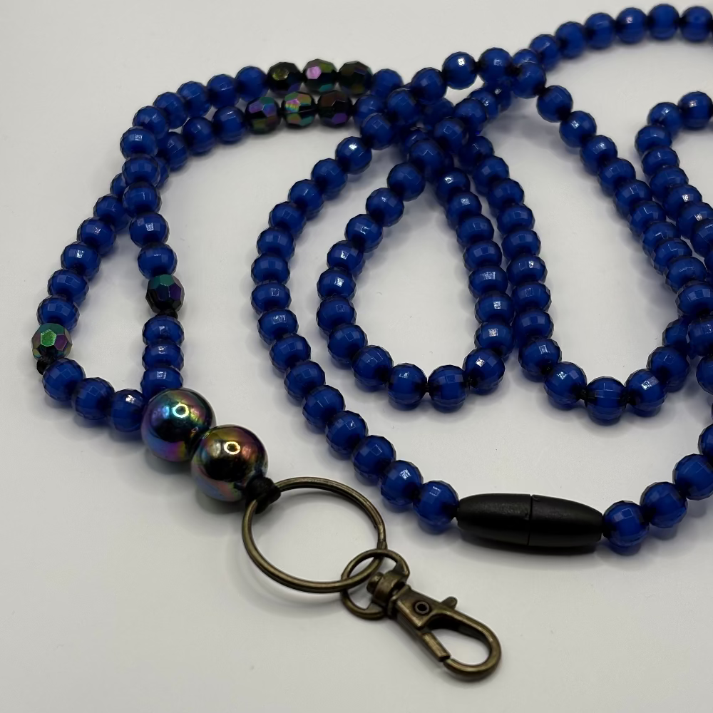 Punottu akryylihelmistä, turvalukko muovia, avainrengas metallia.